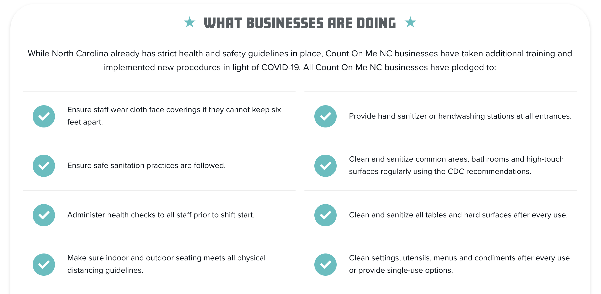 The North Carolina Count On Me Program is a public health initiative that specifically trains businesses to help keep everyone—both employees and guests—safe from COVID-19.